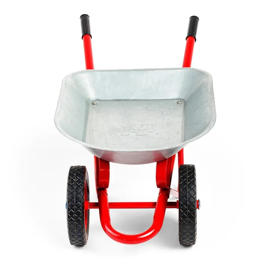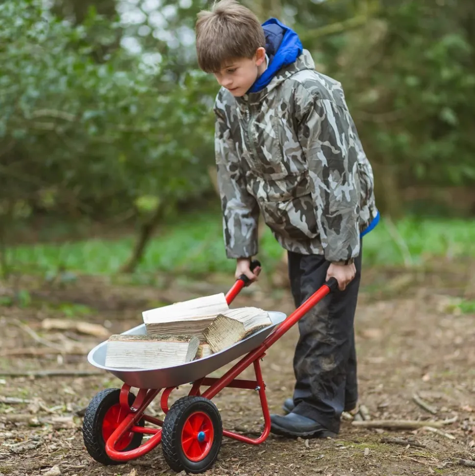 A well balanced, strong metal wheel barrow to transport anything you need to move around the garden, yard or building site. This wheelbarrow is designed for the youngest users, with two front wheels and the tipping stop at the front, allowing them to tip the load without the risk of the barrow falling sideways or too far over.