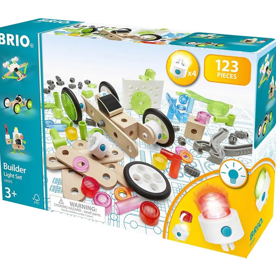 A building set with a difference, this set if compatible with all BRIO building sets but also includes 4 battery light components which have 4 modes. On / Off/ Pulsate / Blink. These also have covers which can fit over the lights to change the colours. Add these into the wheels, make coloured arms on robots or under your planes. Their uses are endless. The set comes with easy to use tools to help you construct your models and take them apart again. Age 3+ Set includes 120 pieces.