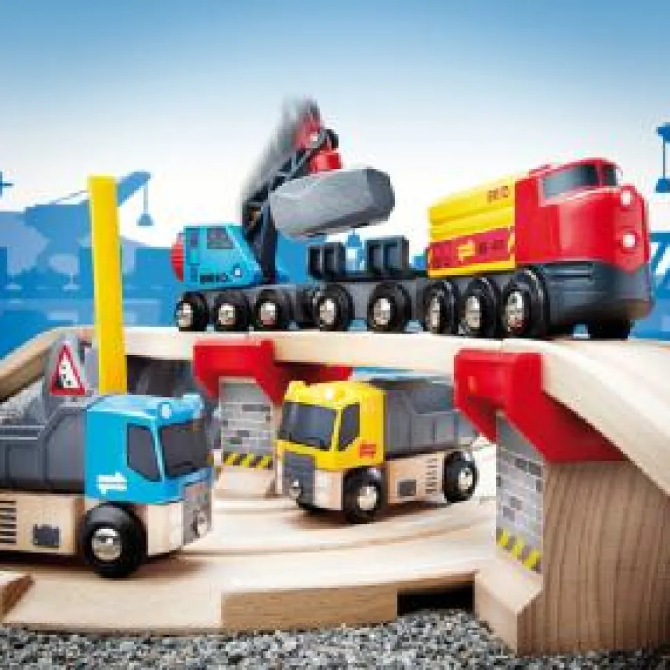 Combine the railway with the road, this set gives you both track and road, to allow you to develop and add to both sets. The railway set is a loop with a raised section and level crossing whilst the road has the road part of the level crossing, meaning you have to wait for your train to cross and also a ramp at either end so you can run on the floor when you have come to the end of the road. The set also has wagons, a train and a rail crane to allow you to transfer your loads. Age 3+