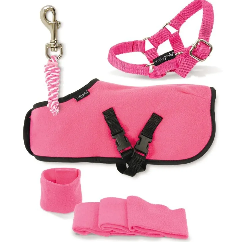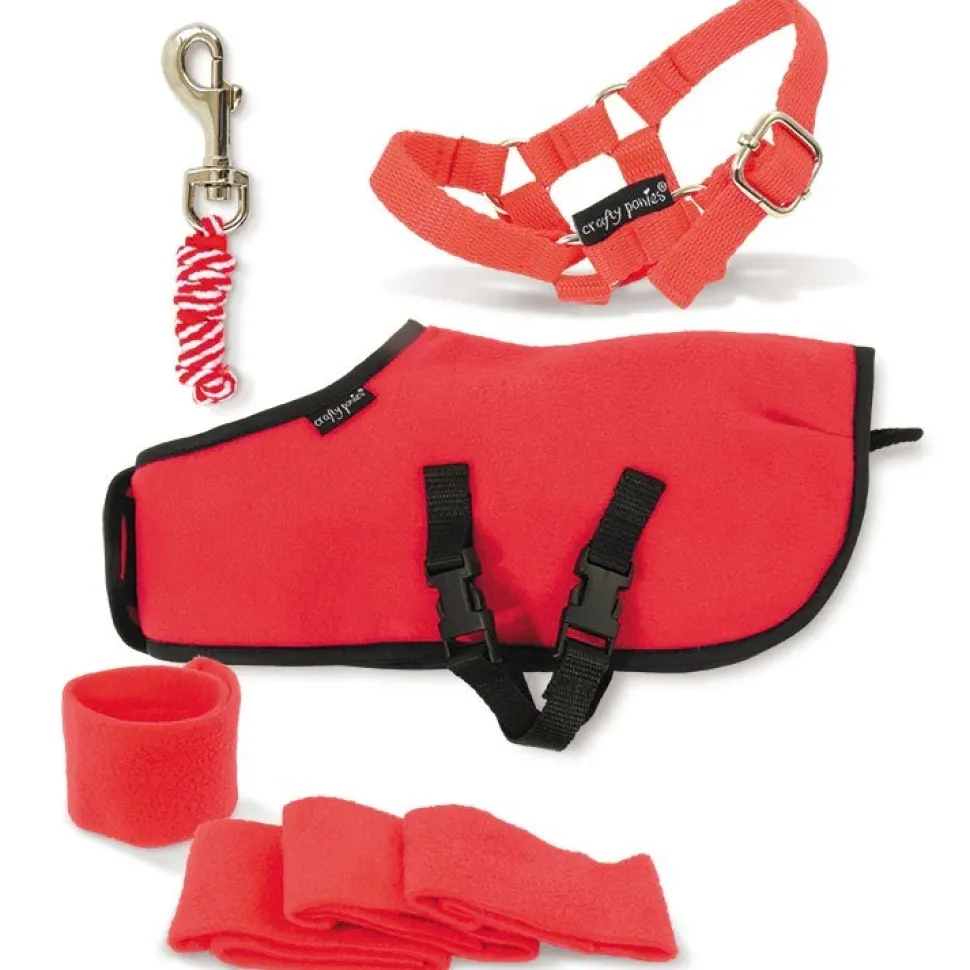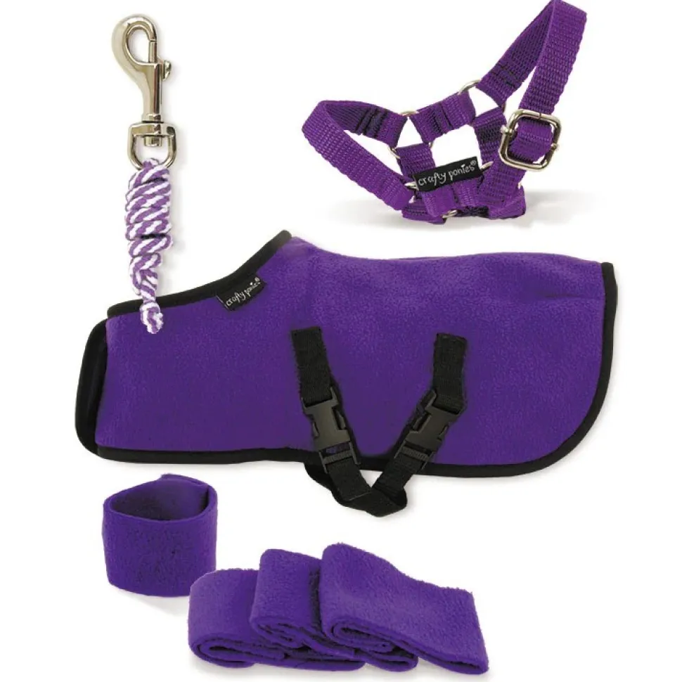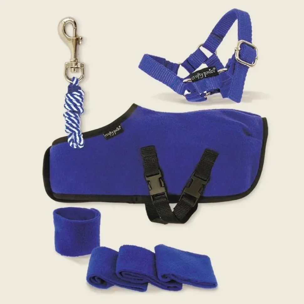 Set includes; Fleece Rug with cross surcingle’s (straps), head collar, lead rope, leg wraps and instruction booklet.