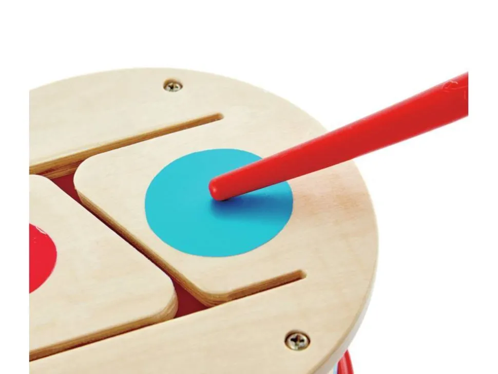 A wooden drum with a nice sound and two beaters, this drum does have two sides but it has so many more sound making options. One side has a plastic skin for the traditional sound, the other wooden side has two different tones, you can also make lots of differents sounds running your beaters round the rim across the different ridges and bumps.