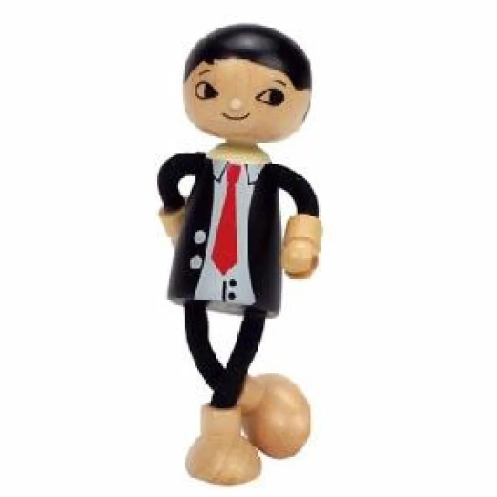 A modern dad home from the office ready to live in your dolls house.The dolls have wooden heads, hands and feet and bendable arms and legs so they can move and sit down. Age 3+