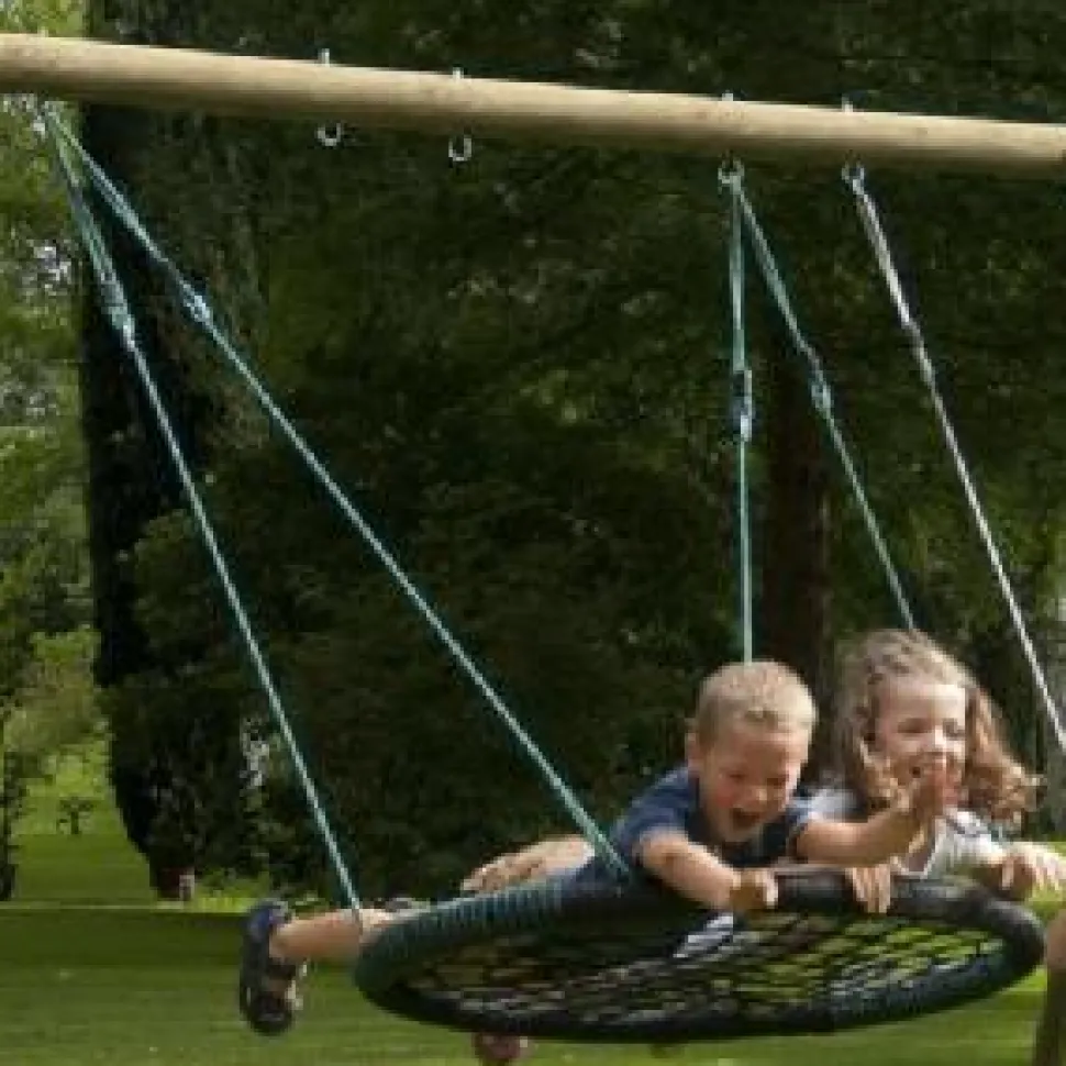 You can have your very own nest swing like the ones at the park! You can sit on it or lie down to swing and watch the world go by. Nest swing is suitable for use by 1 or 2 children. Features soft impact zone. Adjustable rope length. Requires 2 swing seat positions on a swing frame Age 3-12 years. Max user weight 160kg 2 users.