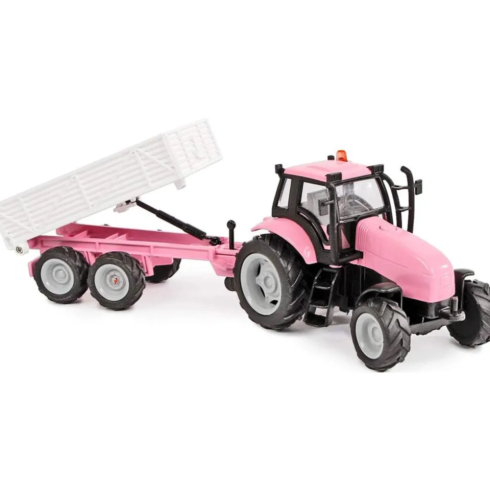 A friction powered Die Cast tractor in pink with removable trailer. The tractor has link hooks at the front and back and a button which starts the engine and the flashing light on the roof. The trailer is removable, has a drop down back door, the back tips up with the leaver at the hitch and it has a lift up stand with leaver to keep it out the way when its hooked up to the tractor. Age 3+