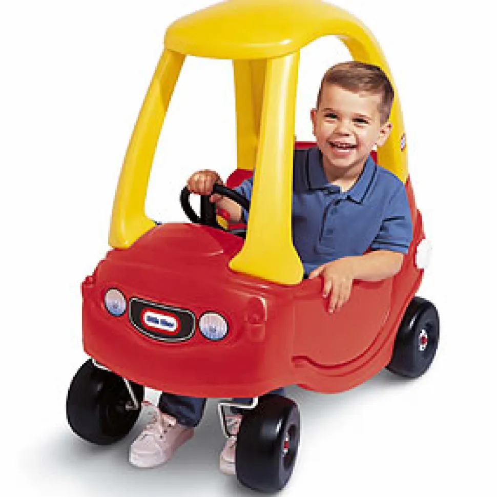This is an old version of the classic foot powered cozy coupe. No eyes, no footplate and best of all bigger!!!It has a clicking key as well as the high seat back, storage area and working horn. AGE 18 months – 5 years