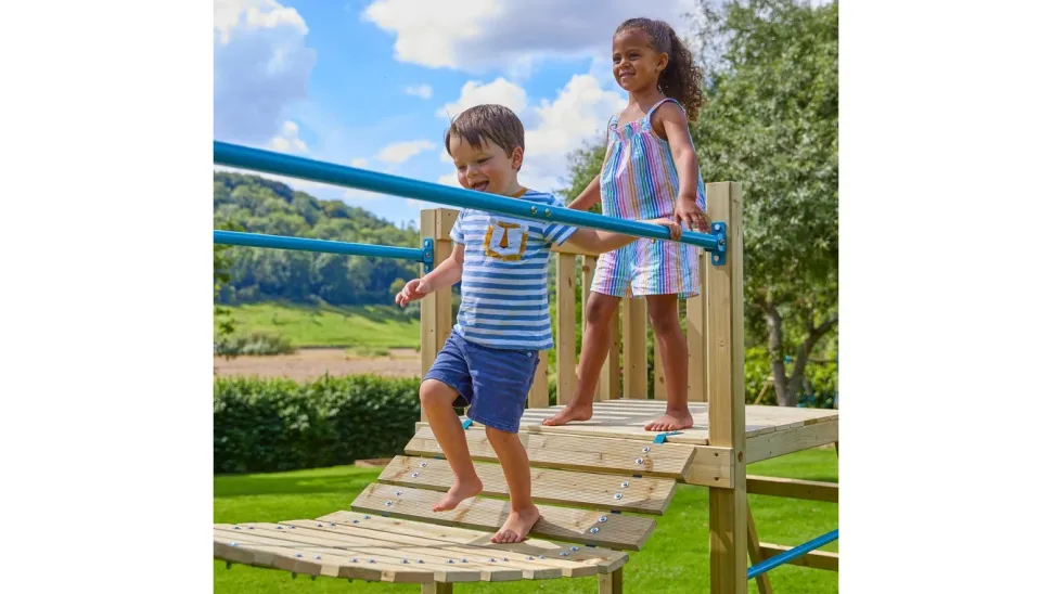 The bridge comes with support bars for you to hold onto and the wobbly timber bridge to walk on.
