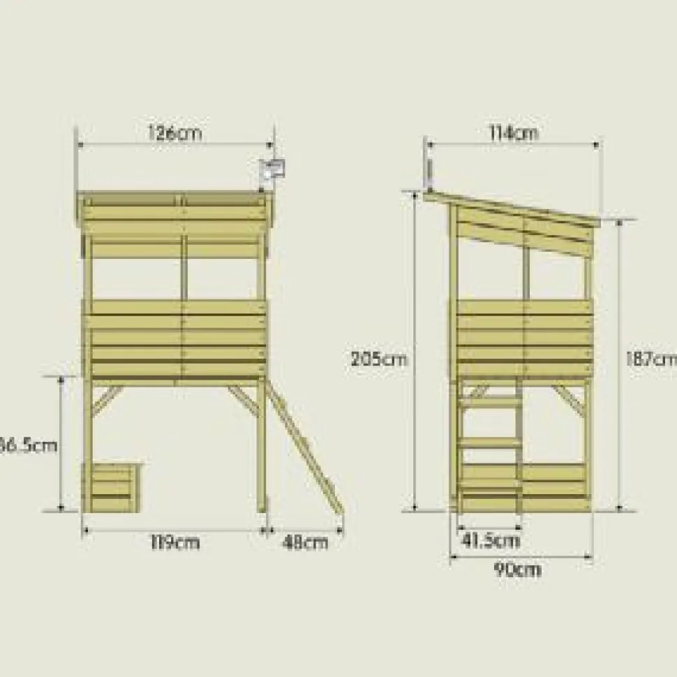A large raised wooden playhouse, complete with a storage box, slide and a play area underneath. Climb the ladder to access your raised platform with fantastic views, then whizz down the 1.8m slide. Underneath the house the covered area with its lidded play box, adds an extra area and dimension to your fun. All the timber is FSC certified European Pine or Spruce, has been pressure treated and comes pre drilled for easy construction. Platform height 86.5cm. The boxes are long and narrow so will fit in a car easily with a passenger and back seat down.