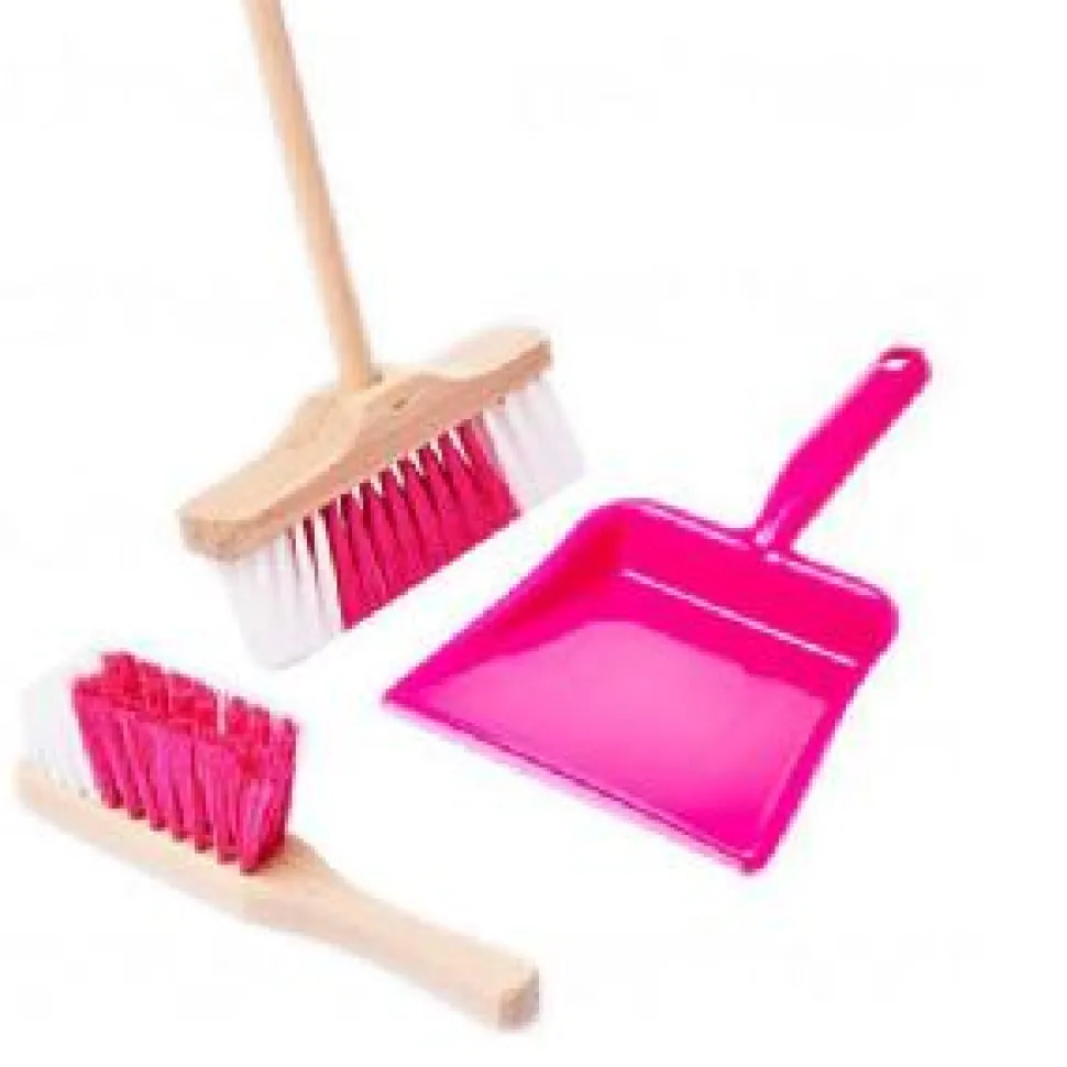 A handy dust pan and brush set with a separate broom. The hand brush and broom have smooth wooden handles and the dustpan is nice and strong. Age 3+ Also available in Blue.